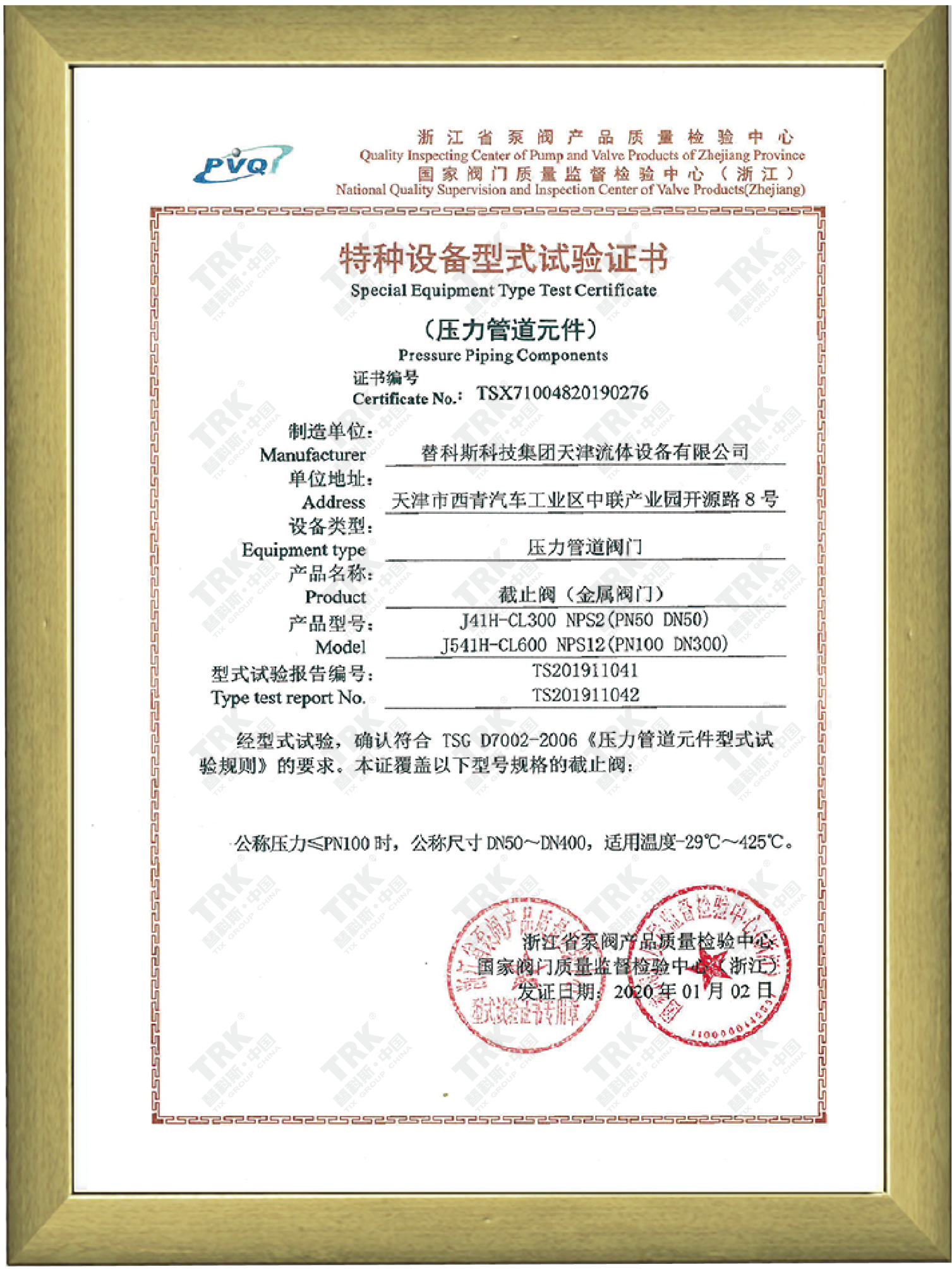 特種設備型式試驗證書-截止閥